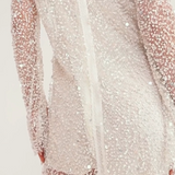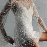 Cette robe courte transparente ornée de sequins est parfaite pour vos soirées les plus chics. Ses manches longues évasées et son col rond ajoutent une touche élégante.